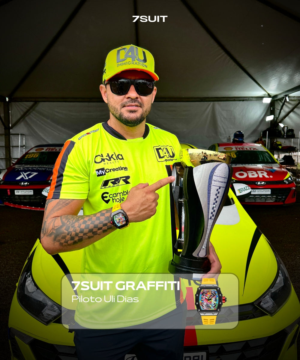 Uli Dias is the absolute star of the national motoring elite. The Hyundai HB20 ELITE model range for 2024 represents the perfect combination of style and performance. As an official ambassador from 7SUIT, Uli uses the Graffiti Amarelo , a model that reflects his spirit, his vibrant personality and his commitment to victory.