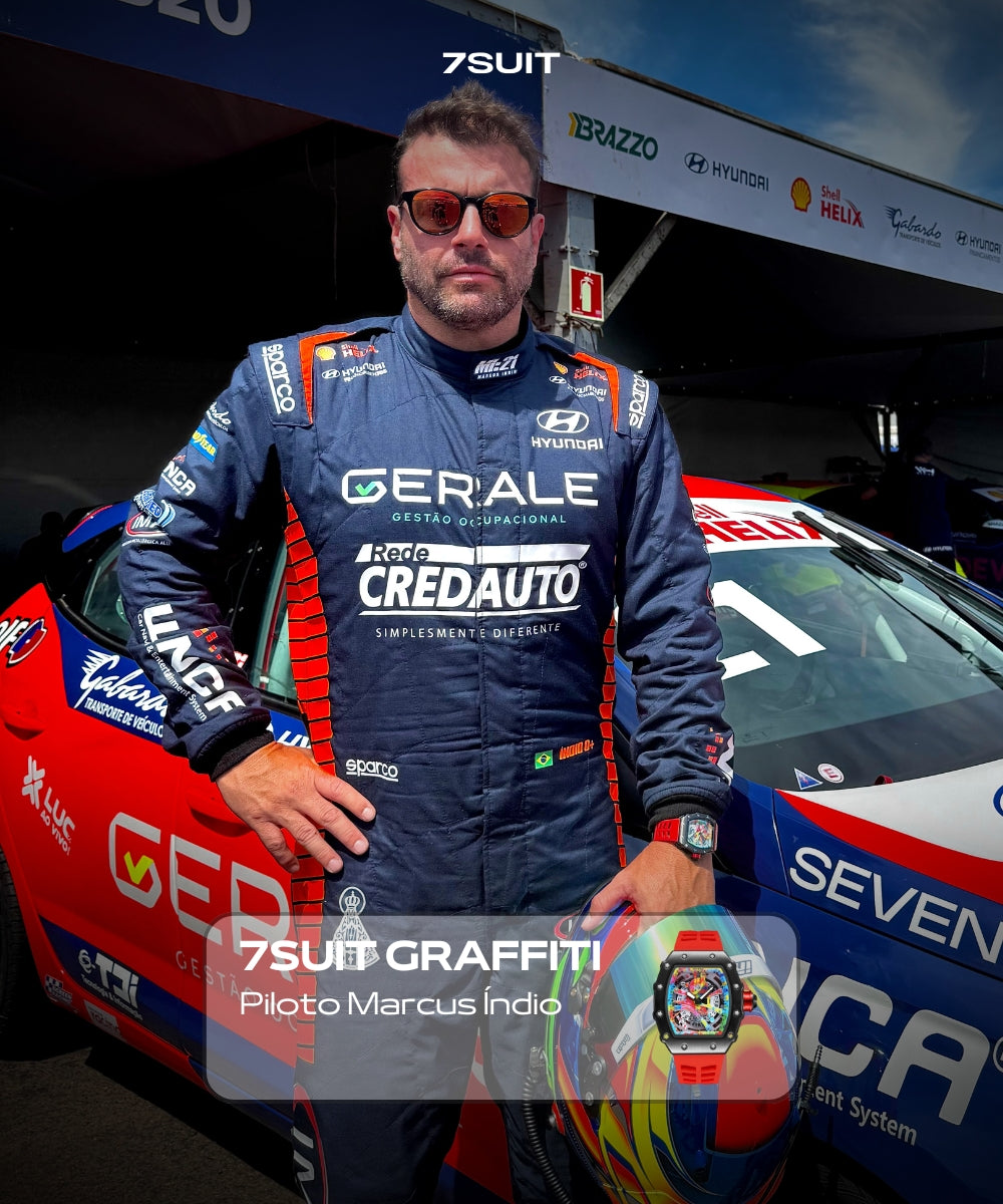 Marcus India is synonymous with presence and consistency on the tracks. Hyundai HB20 PRO Cup Championship in 2024, the driver is driven by the same attitude that leads to the podium: strength, focus and personality. As the official ambassador from 7SUIT, Marcus picks up the Graffiti Vermelho model - a watch as striking as its trajectory, which translates the brand's essence into and out of the bullfights.